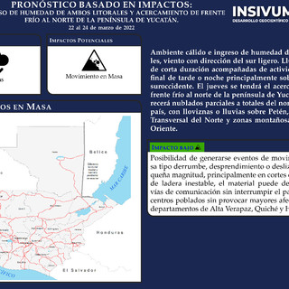 Insivumeh informa sobre el Pronóstico Basado En Impactos del 22 a 24 de marzo de 2022, donde se establecen los probables impactos que se podrían presentar en el país